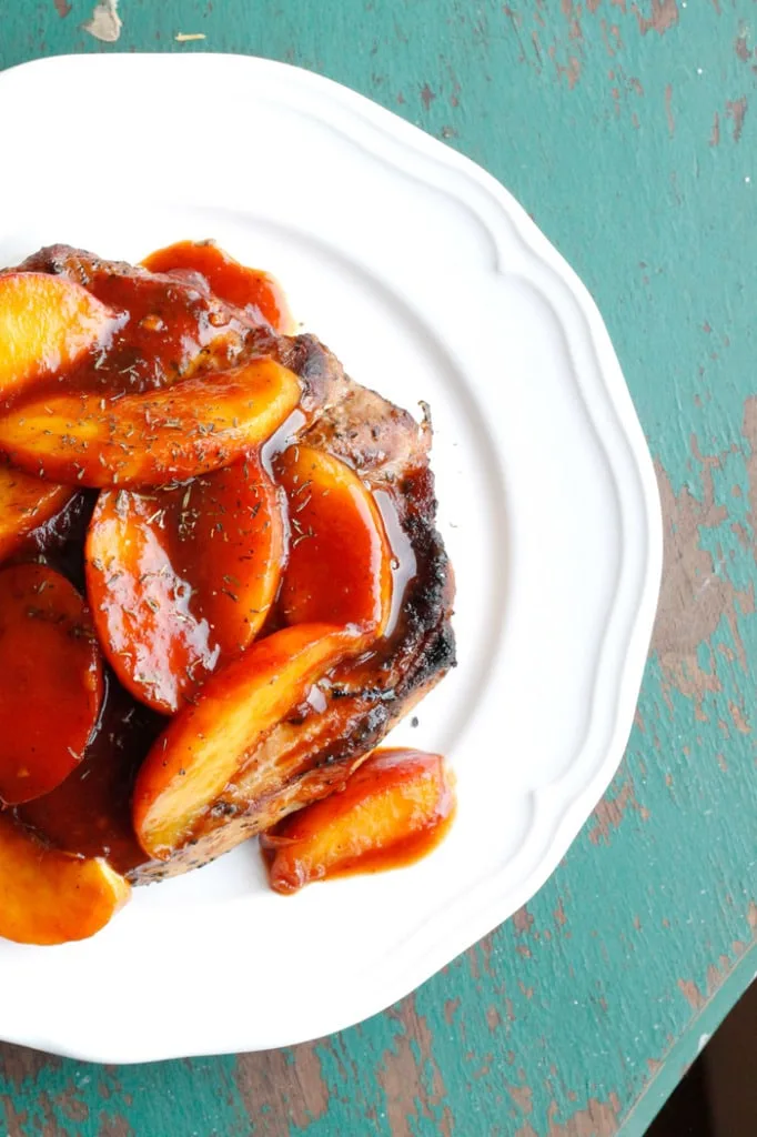 Fresh peaches are cooked into a super simple barbecue sauce mixture to make a sweet and tangy sauce that takes this grilled pork chops recipe to the next level.